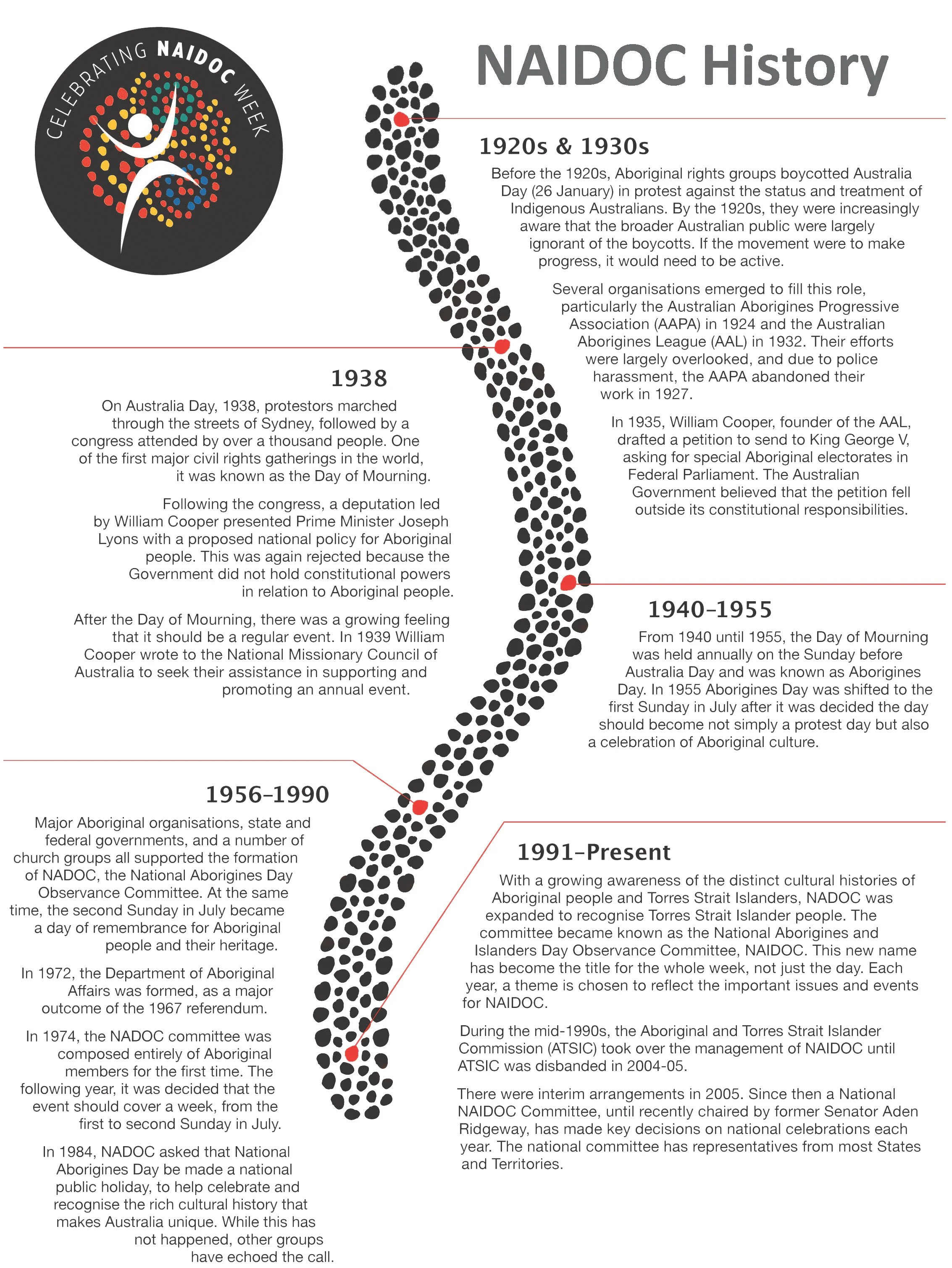 National NAIDOC Week celebrations are held across Australia in the first week of July each year (Sunday to Sunday), to celebrate and recognise the history, culture and achievements of Aboriginal and Torres Strait Islander peoples. NAIDOC Week is an opportunity for all Australians to learn about First Nations cultures and histories and participate in celebrations of the oldest, continuous living cultures on earth.